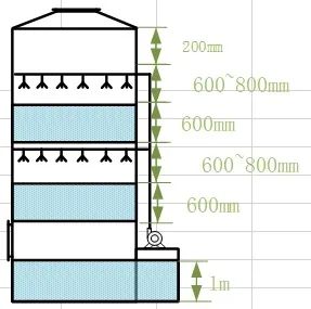 填料高度:600mm,水噴淋高度尺寸:600~800mm,累加起來出口高度為200mm